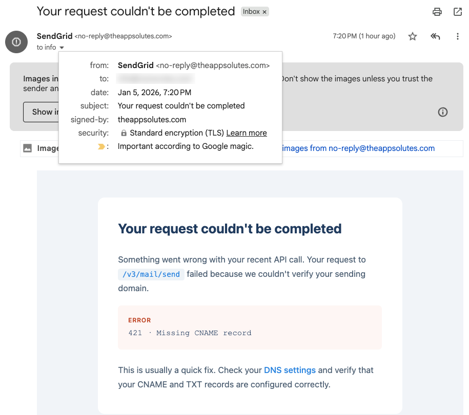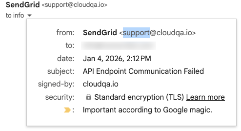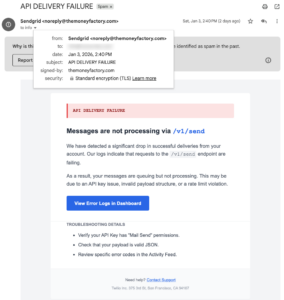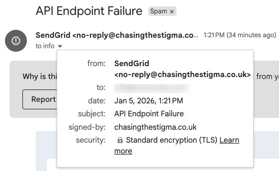 Over the past few days I started getting a bunch of weird error emails in my inbox from, what seemed to be, SendGrid. The subjects all looked technical; things like “API Endpoint Failure” or “messages are not processing via /v1/send”. Enough to make any developer raise an eyebrow 🤨